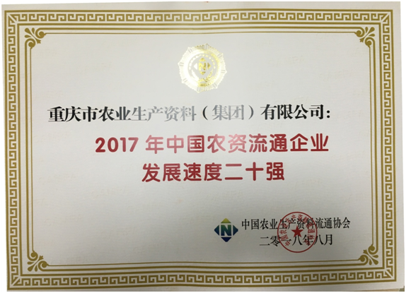 重慶農(nóng)資集團獲得“2017年中國農(nóng)資流通企業(yè)發(fā)展速度20強”榮譽稱號!