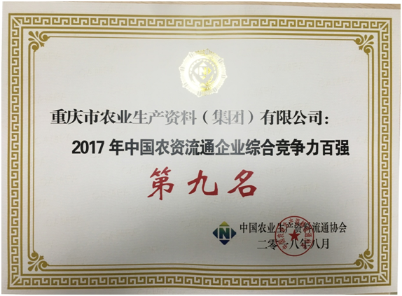重慶農(nóng)資集團在“2017年全國農(nóng)資流通企業(yè)綜合競爭力百強”企業(yè)排名位列第九名!