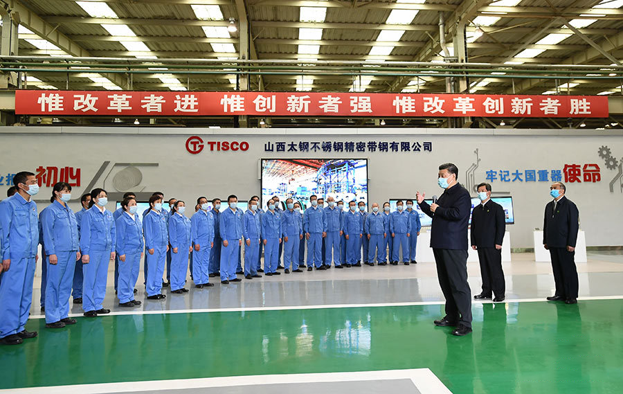 2020年5月12日,習(xí)近平在山西太鋼不銹鋼精密帶鋼有限公司同企業(yè)職工親切交流。