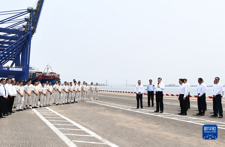 隨后,習(xí)近平來到洋浦國際集裝箱碼頭小鏟灘港區(qū),了解港口建設(shè)發(fā)展情況,同現(xiàn)場作業(yè)人員、掛職干部代表等親切交流。習(xí)近平強(qiáng)調(diào),振興港口、發(fā)展運(yùn)輸業(yè),要把握好定位,增強(qiáng)適配性,堅(jiān)持綠色發(fā)展、生態(tài)優(yōu)先,推動港口發(fā)展同洋浦經(jīng)濟(jì)開發(fā)區(qū)、自由貿(mào)易港建設(shè)相得益彰、互促共進(jìn),更好服務(wù)建設(shè)西部陸海新通道、共建“一帶一路”。他指出,黨中央選派干部來自由貿(mào)易港掛職,既體現(xiàn)了黨中央對自由貿(mào)易港建設(shè)的關(guān)心和支持,也是對干部的培養(yǎng)鍛煉,要發(fā)揮掛職干部的積極作用,讓他們在基層一線增長才干。